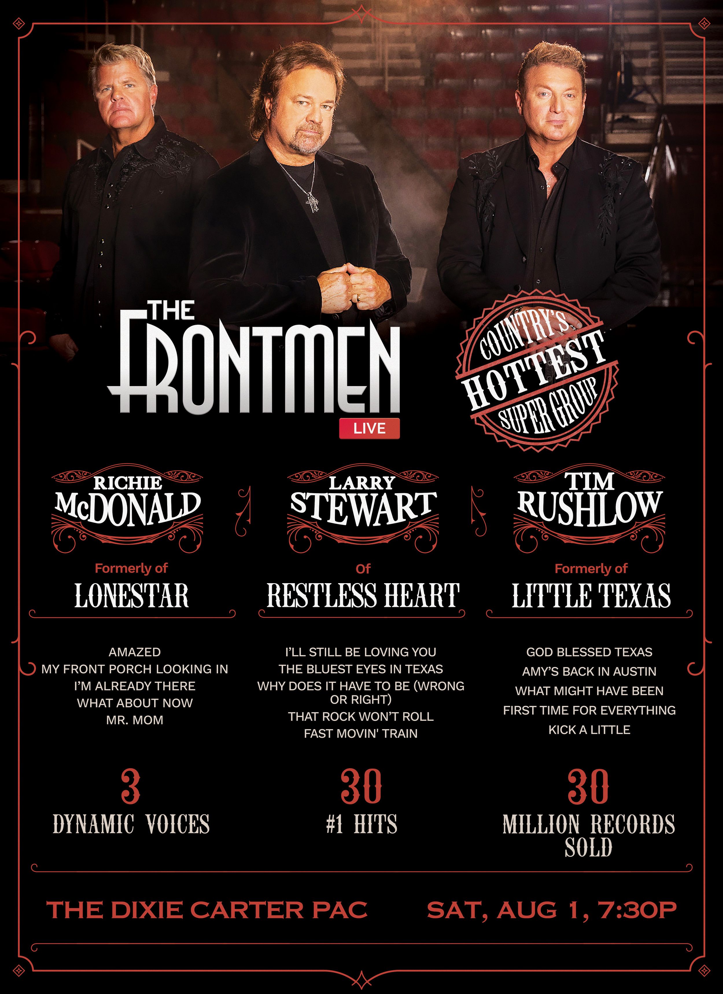 The supergroup unites three powerhouse lead singers—Richie McDonald (formerly of Lonestar), Larry Stewart (of Restless Heart), and Tim Rushlow (formerly of Little Texas). Together, they deliver a high-energy show of 90s country anthems like “Amazed,” “The Bluest Eyes in Texas,” and “God Blessed Texas”—alongside fresh new music that defines THE FRONTMEN today.